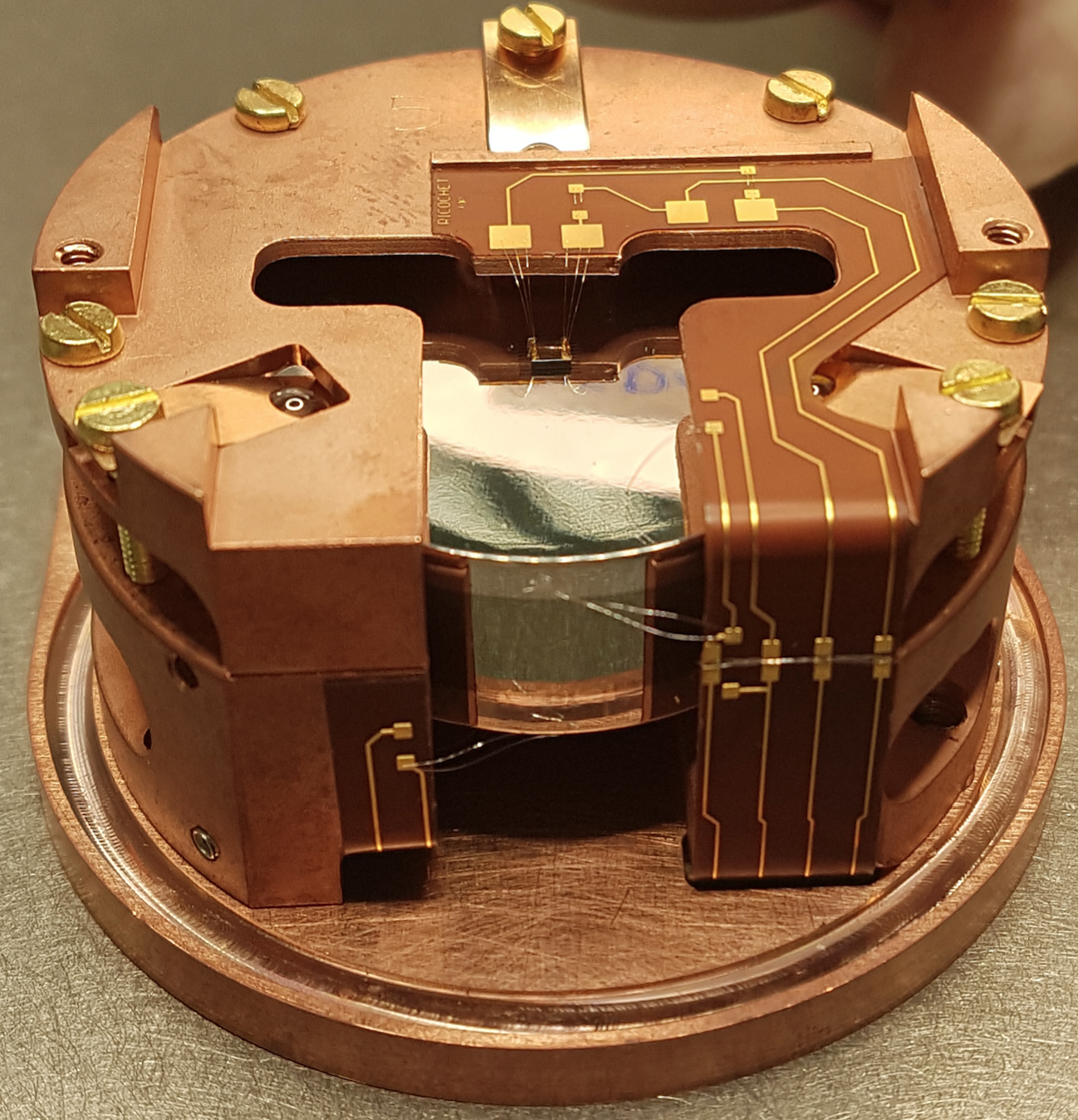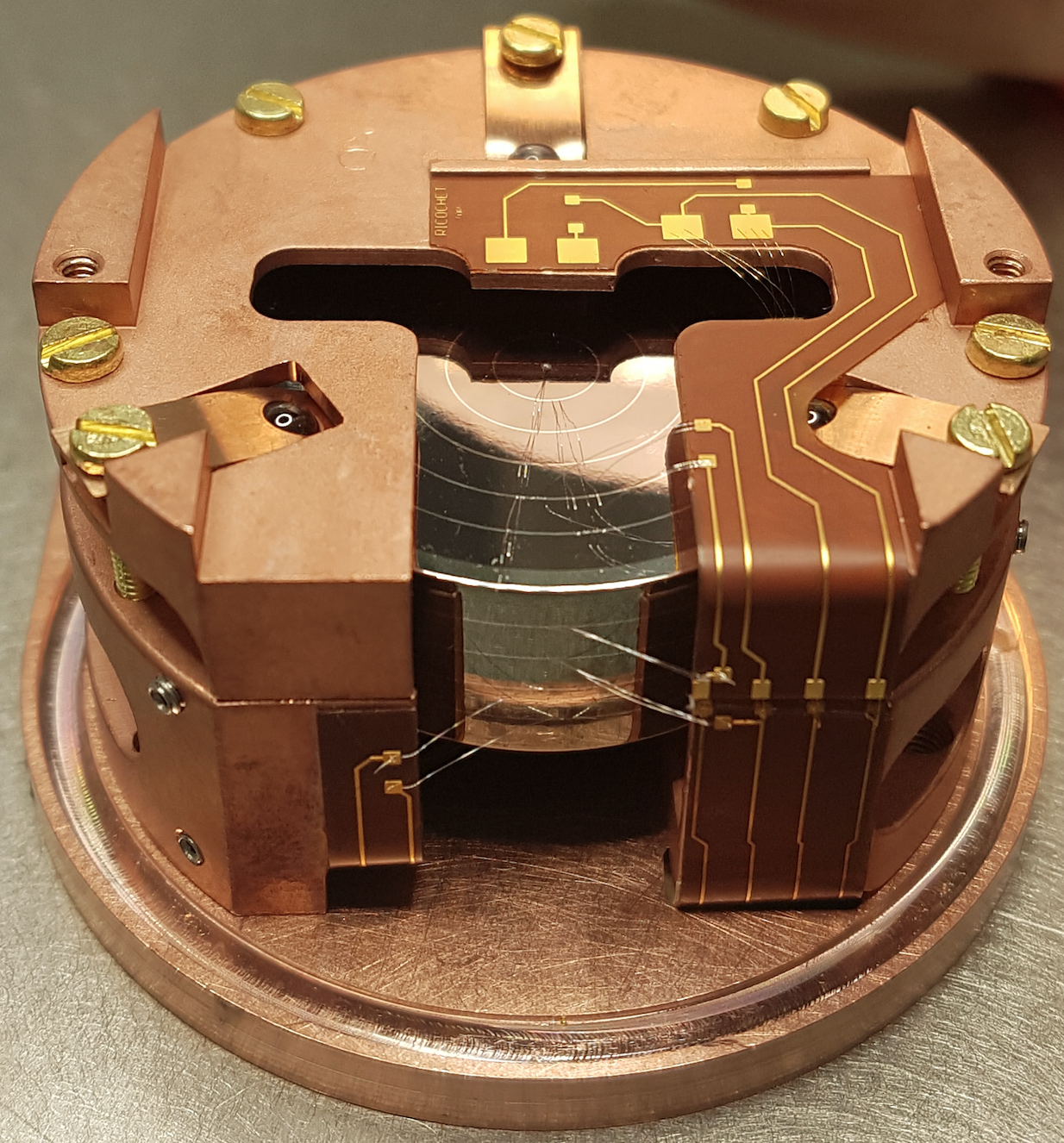 A miniCryoCube (left) and detectors with planar (center) and fully interdigistised (right) electrodes (credit: Ricochet collaboration).