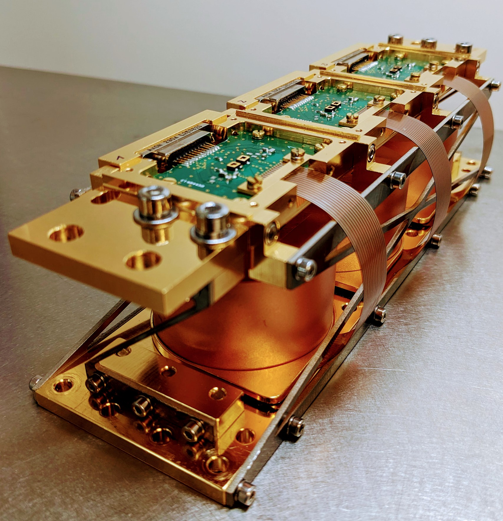 The full CryoCube payload (left) and a single planar detector before being placed in a miniCryoCube sub-array (right) (credits: S. Monfront - ILL and Ricochet collaboration).